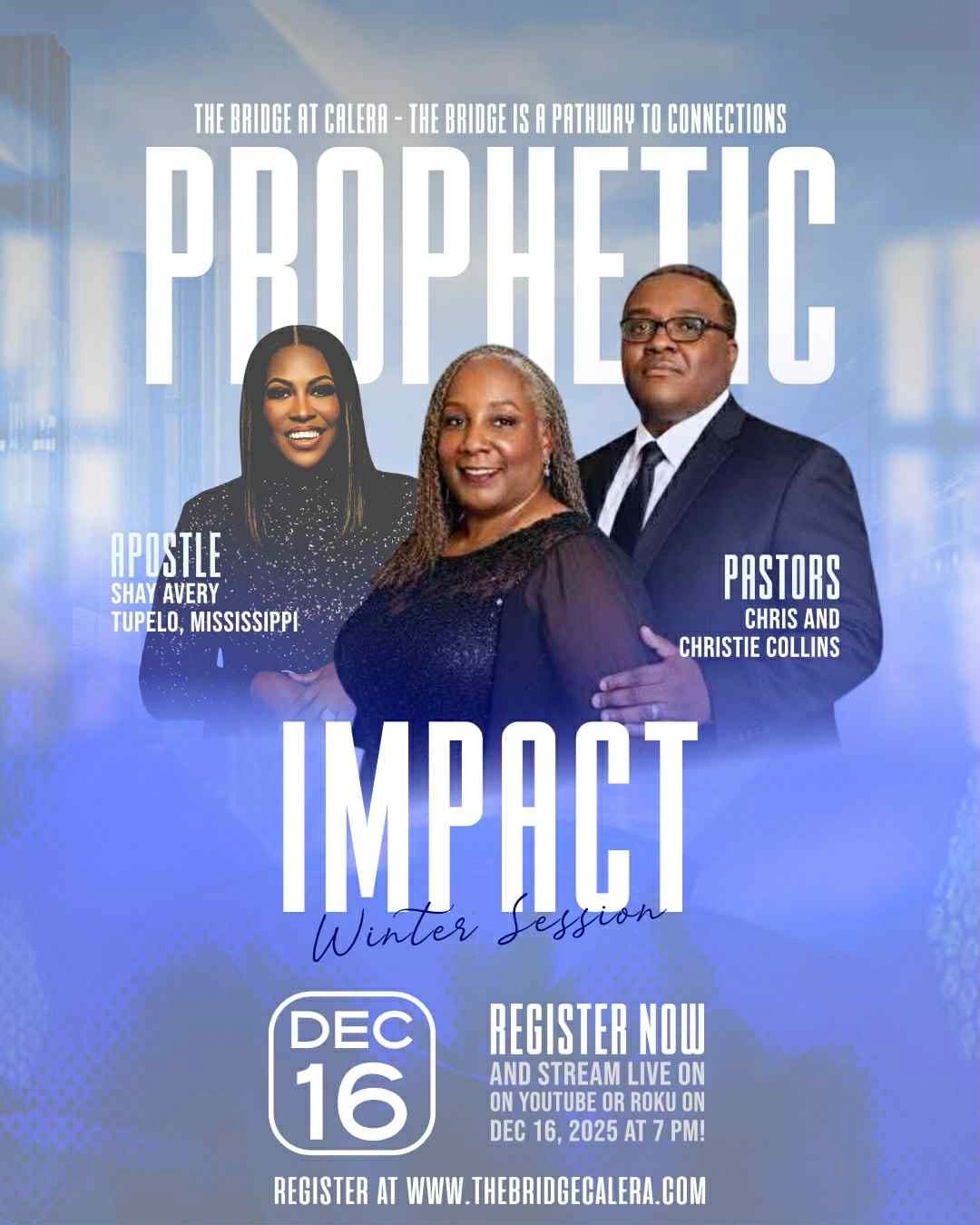 Join us for Prophetic Impact. This will be an amazing session with Apostle Shay Avery. Registration is now open. Register at www.thebridgecalera.com